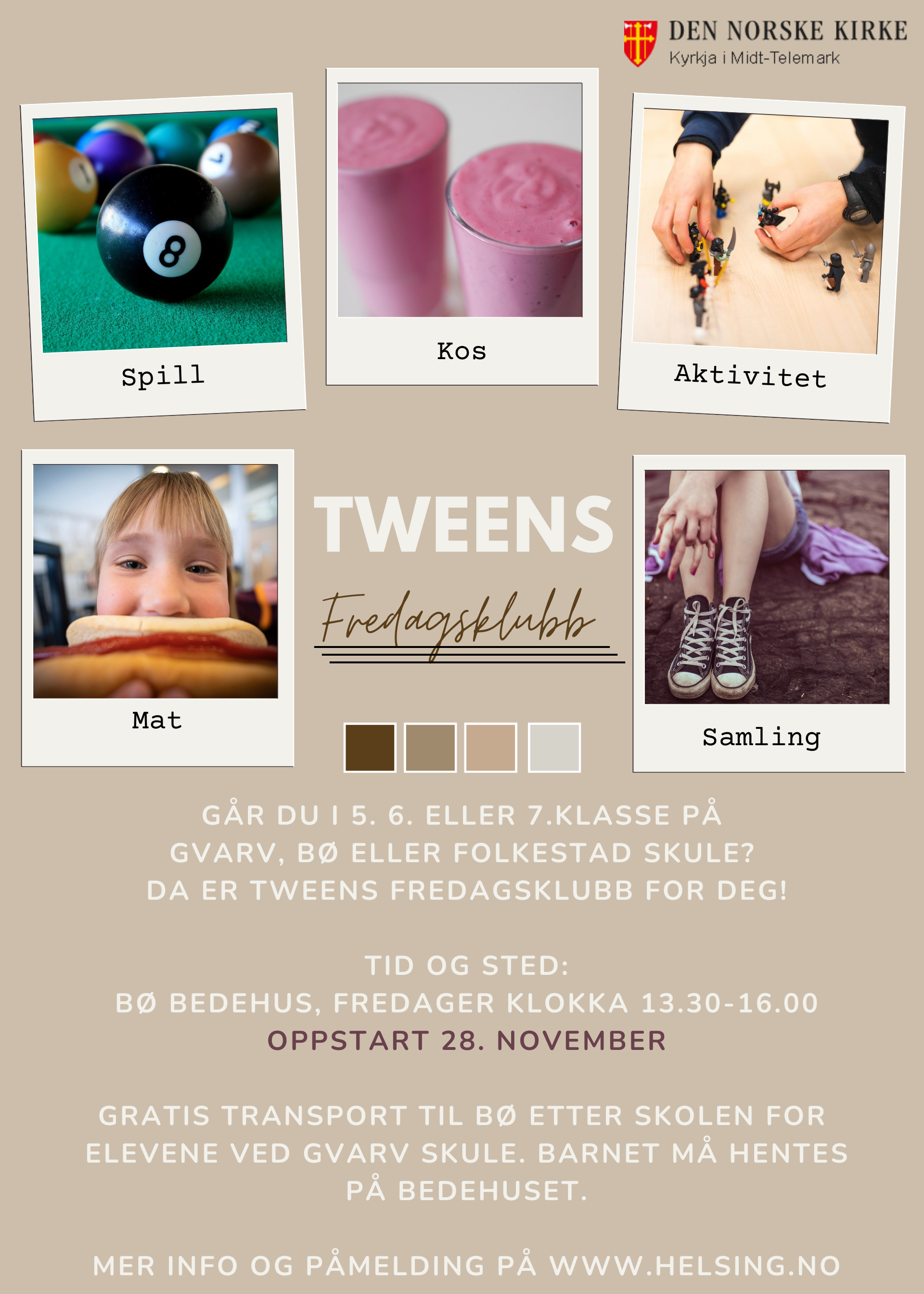 Alle elever i 5.-7. klasse ved Gvarv skule, Folkestad skule og Bø skule er invitert til å bli med på kirka sitt etterskoletid-tilbud. Tweens fredagsklubb er hver fredag på Bø bedehus, fra 13.30-16.00. Elevene på Gvarv skole får tilbud om gratis skyss etter skolen til Bø. Buss/biler går fra Gvarv skole 13.35. Barna må hentes på Bø bedehus klokka 16.00
